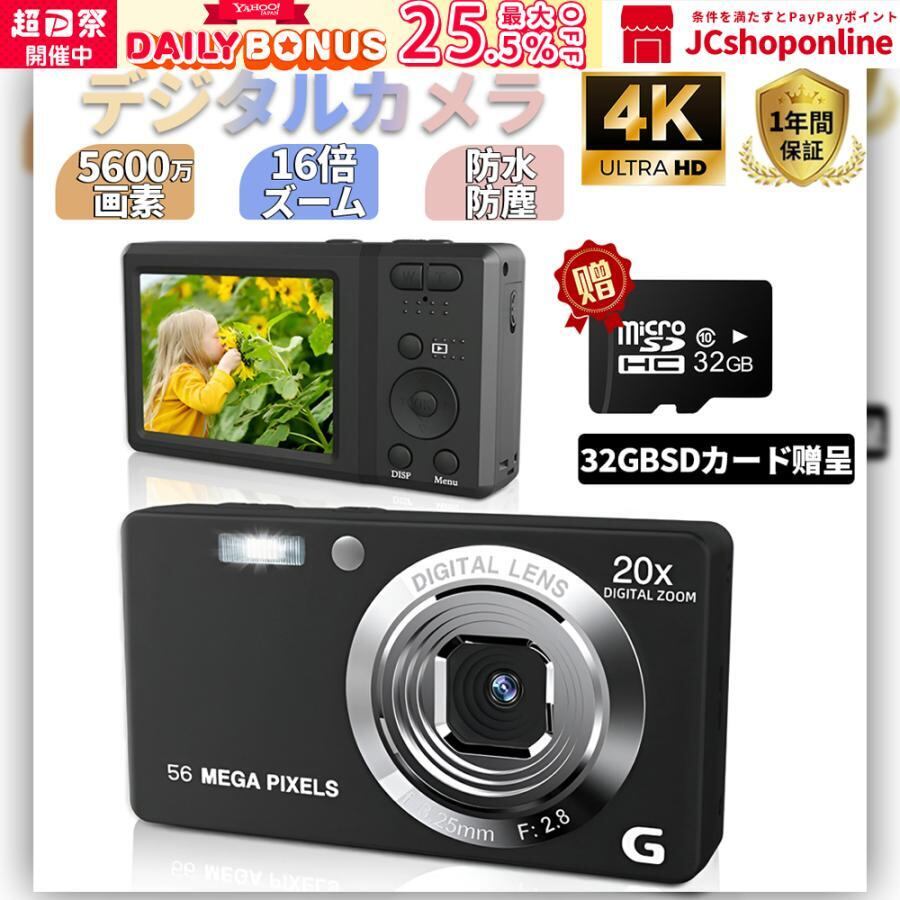 デジタルカメラ 4K 2.0インチ 5600万画素 16倍ズーム 動画撮影 高画質 自撮り 動画 AF機能 手ブレ補正 防塵 耐衝撃 軽量 携帯便利 IPS大画面 初心者 2024 新品