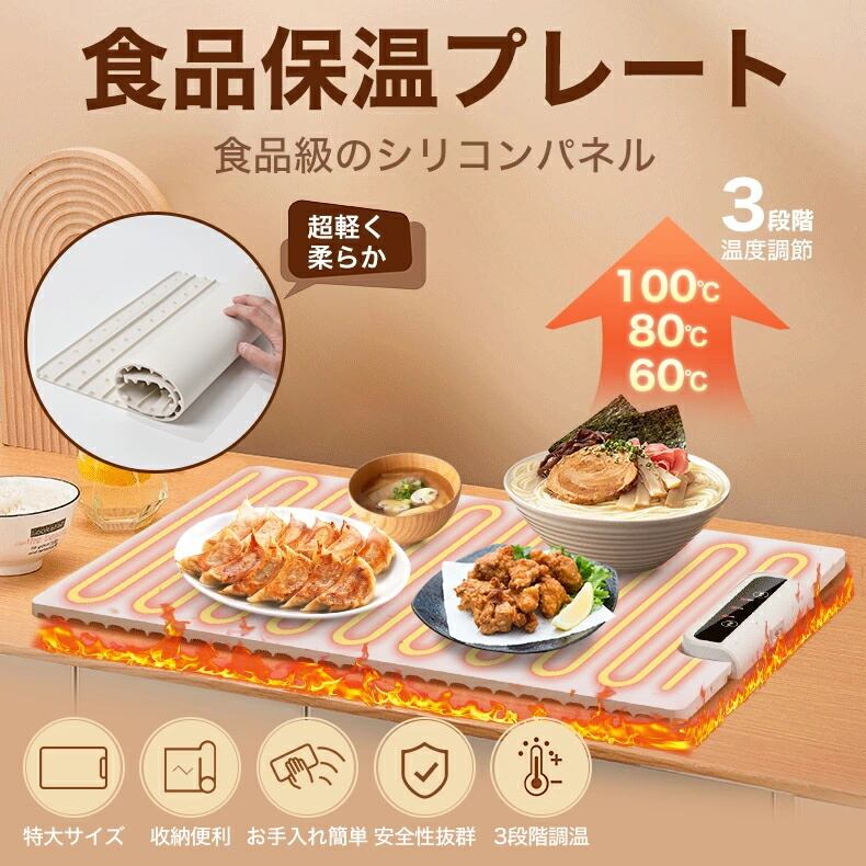 ホットプレート 電気保温トレイ 食品保温プレート 3段階温度調節 10秒急速加熱 折り畳み式 60℃/80℃/100℃ 多機能食品断熱ボード加熱 収納袋付き パーティー用