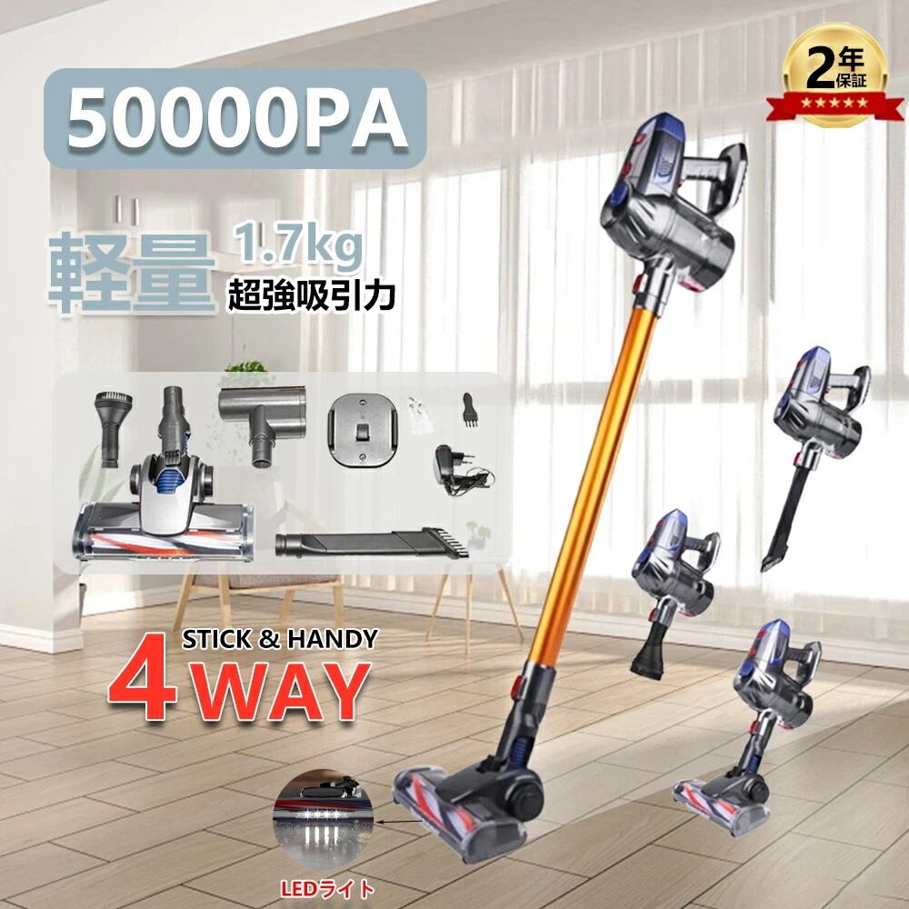 掃除機 コードレス 充電式 スティック型 50000Pa ハイパワー 強力吸引 4WAY 洗えるフィルター 4種類ヘッド 角度調節可能 静音作動 LEDライト搭載 乾湿両用 省エネ